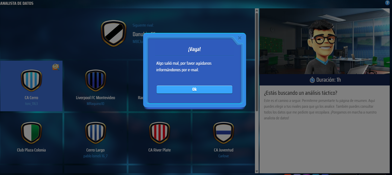 en 3 horas juego un partido y no me anda el analista, al intentar usarlo me sale el siguiente error.